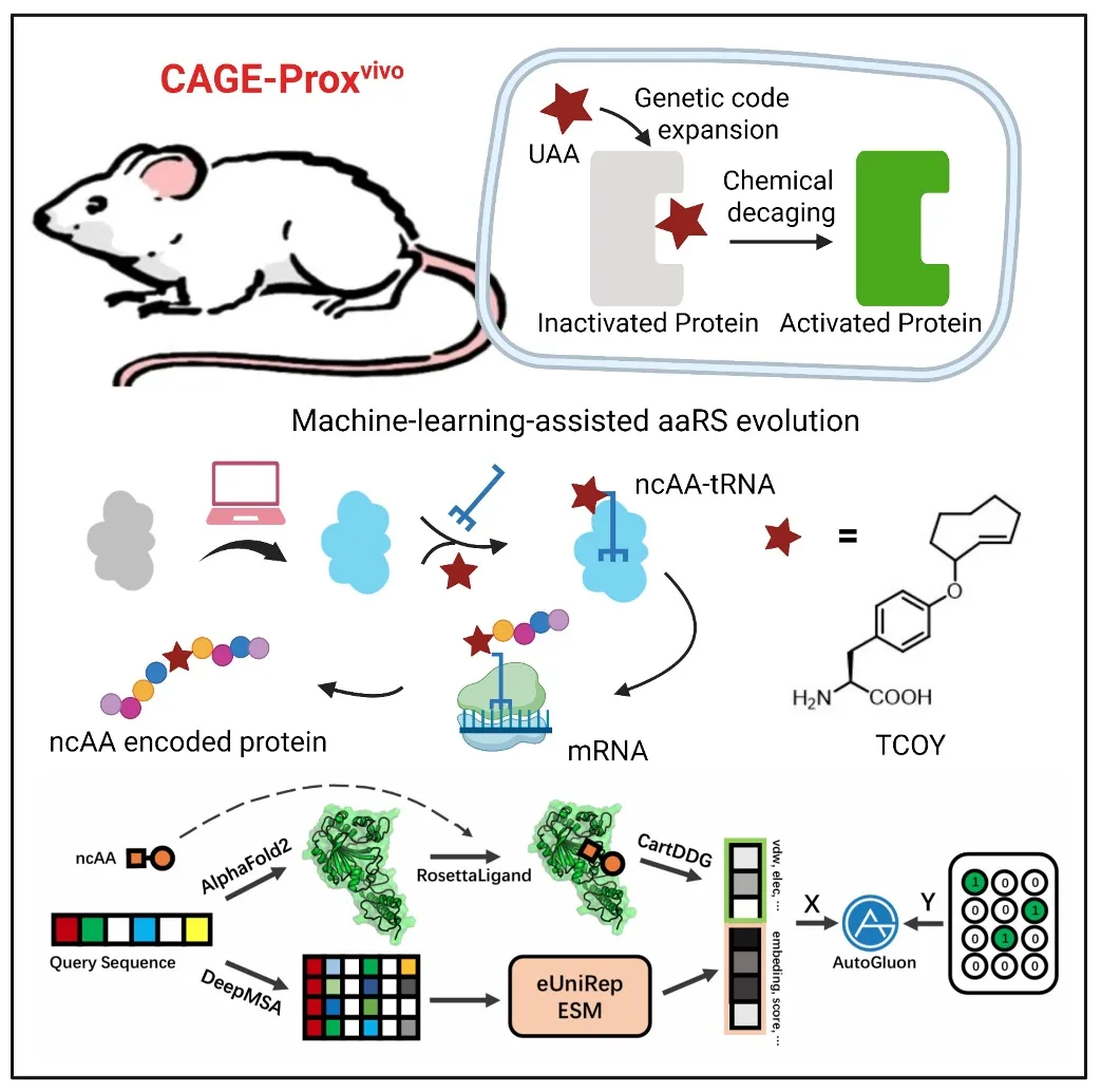 机器学习驱动的蛋白质活体激活策略:通过蛋白语言模型训练机器学习算法,设计和筛选tRNA合成酶(PylRS)变体,实现了可化学脱笼的反式环辛烯-酪氨酸(TCOY)的识别和编码表达,用于后续在体蛋白质功能激活和互作调控