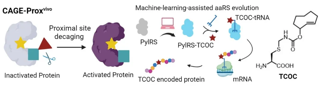 机器学习模型成功进化出可识别反式环辛烯-半胱氨酸(TCOC)的PylRS变体,并通过CAGE-Proxvivo策略实现了半胱氨酸的可控化学遮蔽以及活体内蛋白功能的精准调控