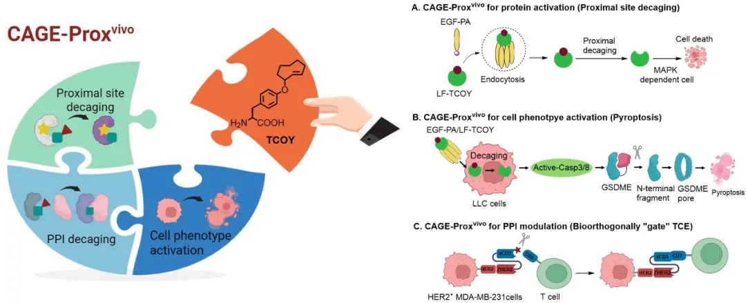 CAGE-Proxvivo蛋白质活体原位激活通用平台应用:在活体动物中按需激活蛋白质功能;调节细胞表型,诱导肿瘤细胞发生焦亡,增强抗肿瘤免疫反应;精确调节蛋白质-蛋白质相互作用,实现生物正交“门控”双特异性抗体,用于按需招募和激活T细胞
