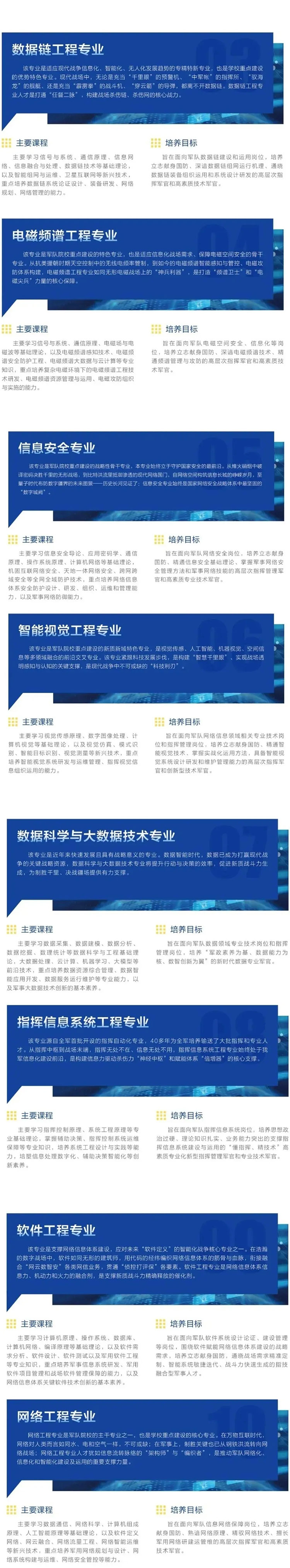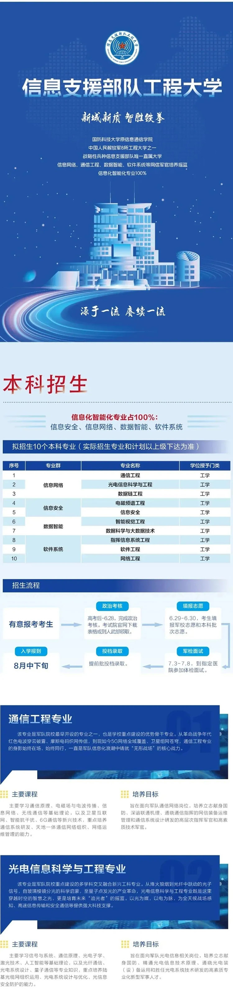 其中,作为全新打造的战略性兵种信息支援部队唯一直属大学——信息支援部队工程大学,首次面向社会招生,10个本科专业,100%信息化智能化。
