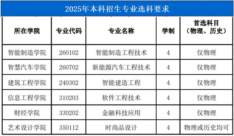 广州职业技术大学是广州市第一所公办本科层次职业大学,该校今年将有6个本科专业招生,共招生470人,学制均为4年。这6个专业分别是:智能建造工程、新能源汽车工程技术、智能制造工程技术、软件工程技术、金融科技应用、时尚品设计。选科要求方面,除时尚品设计外,其余5个专业首选科目均要求物理。
