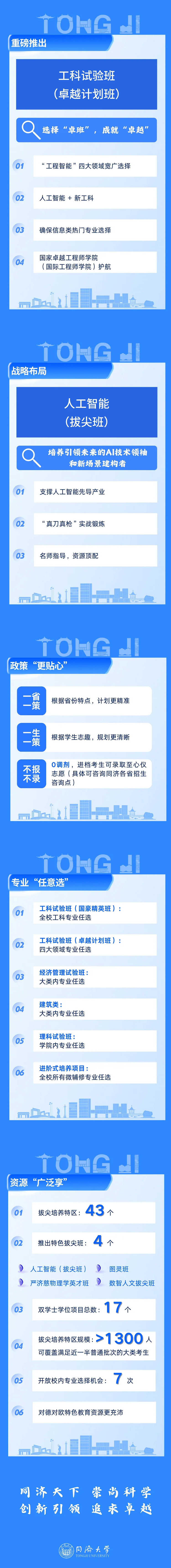 今年同济大学新增人工智能(拔尖班)、图灵班、严济慈物理学英才班、数智人文拔尖班4个拔尖班,拔尖基地(班)总数增至10个。“人工智能(拔尖班)”通过“项目制+导师制”双轨并行,着力培养引领未来的AI技术领袖和新场景建构者。新增建筑学-应用物理学、城乡规划-法学、地质工程-应用物理学3个双学士学位项目,双学士学位项目总数增至17个。新增人才培养模式创新实验区项目5个,土木、建筑、环境领域领军人才班3个。