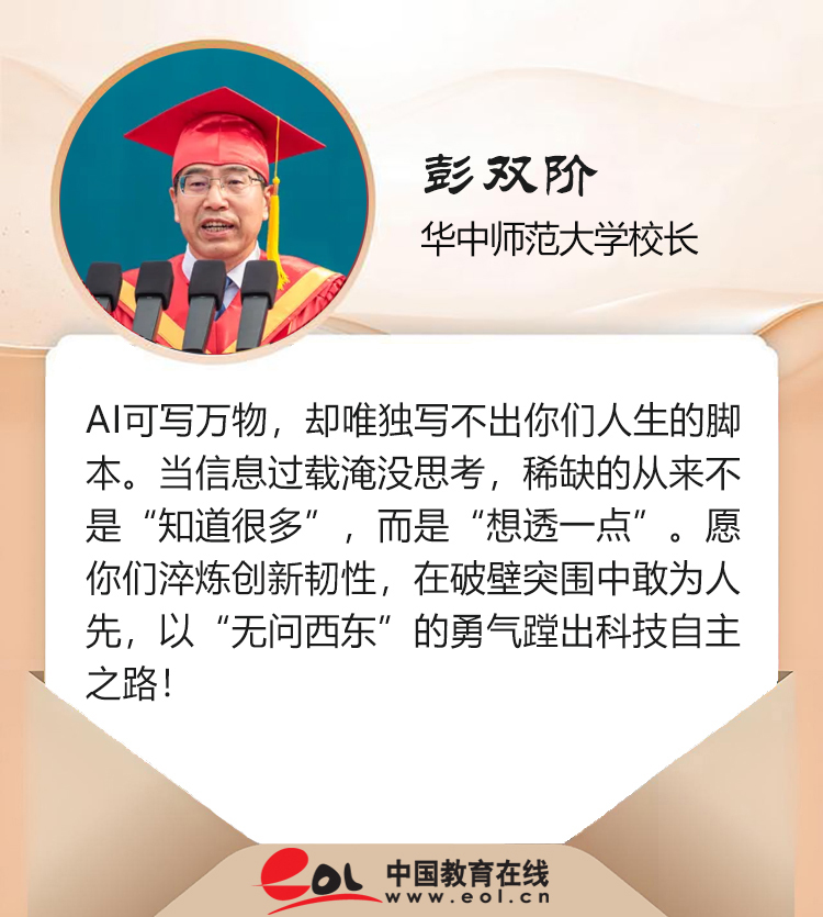 毕业寄语全文→【华中师范大学校长彭双阶:以强韧之姿奔赴时代山海!】