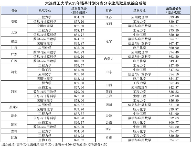 根据教育部《关于在部分高校开展基础学科招生改革试点工作的意见》(教学〔2020〕1号)等文件要求,按照《大连理工大学2025年强基计划招生简章》有关规定,通过组织专家面试,经学校研究同意,现发布大连理工大学2025年强基计划分省分专业录取最低综合成绩。