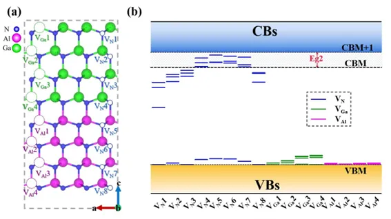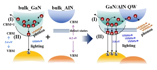 魏苏淮教授和石芝铭、孙晓娟、黎大兵研究员团队基于对氮化物能带结构和载流子动力学的分析,首次提出通过调控GaN/AlN量子阱界面的氮空位缺陷,实现对电子冷却速率的有效增强。这些缺陷状态作为中间能级,能够显著加强电子-声子相互作用,从而加速电子向导带底冷却。第一性原理计算表明,该策略可使电子冷却时间缩短超过一个数量级,有效实现与空穴冷却速率的动态平衡,大幅提升发光效率。与传统EBL结构相比,该方法无需额外结构设计,即可实现电子动力学的精准调控。该研究还进一步拓展了半导体缺陷物理的研究边界,系统验证了缺陷在调控器件性能方面的“有益性”作用,颠覆了缺陷是有害的传统认知,为新一代电子与光电子器件的缺陷工程设计提供了理论支撑和新思路。