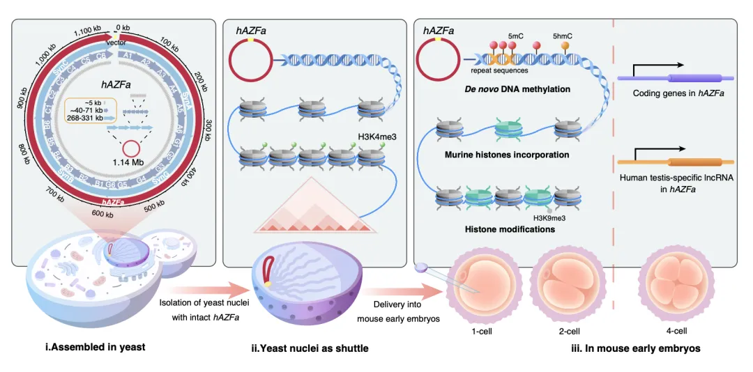 该研究针对人类Y染色体关键功能区——无精子症因子a(AZFa),该区段的缺失会导致最严重的男性不育,通过手术获得精子的概率几乎为零。研究人员提出“组合式层级组装策略”:利用酵母同源重组,通过三步逐级拼接方案,成功实现了这一复杂序列(重复序列占69.38%)在酿酒酵母中的高效组装。团队突破性地开发完整酵母细胞核分离技术,能够提取直径仅1微米的细胞核,不仅确保了核内合成染色体不被降解,更维持了其染色质高级结构特征,利用该方法提出的酵母细胞核可冷冻保存6个月以上。研究团队通过显微注射技术,将合成基因组高效递送至具有全能性分化潜能的小鼠早期胚胎,首次观察到合成基因组在早期胚胎四细胞阶段启动转录的现象。