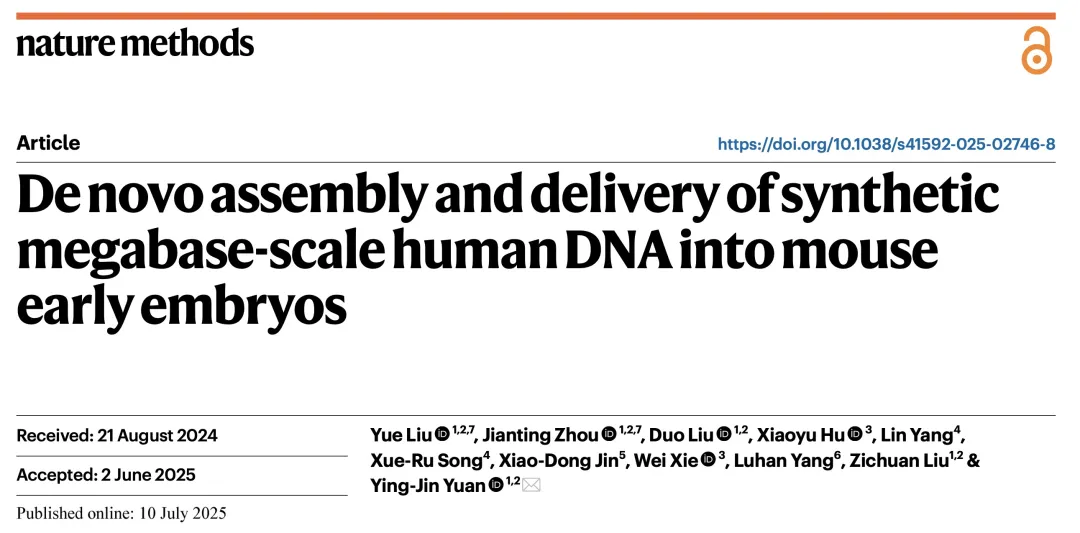 近日,合成生物技术全国重点实验室、天津大学合成生物与生物制造学院元英进院士团队实现大尺度(百万碱基对)人类DNA的精准合成组装与跨物种递送,研究成果于7月10日在《自然-方法》(Nature Methods)刊发,论文名为“从头组装兆碱基对尺度人类基因组DNA并递送至小鼠早期胚胎”(De novo Assembly and Delivery of Synthetic Megabase-Scale Human DNA into Mouse Early Embryos)。元英进院士为论文的通讯作者,博士后刘悦、副研究员周见庭为论文的共同第一作者。该成果是人类基因组合成和转移技术的重要进展,对合成人类基因组具有重要意义。