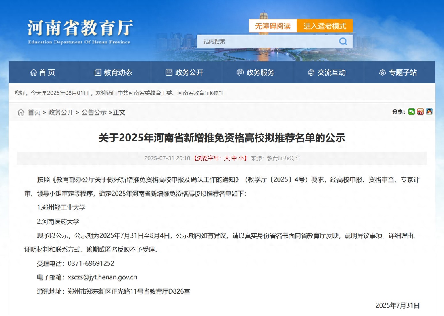 7月31日,河南省教育厅发布《关于2025年河南省新增推免资格高校拟推荐名单的公示》,拟推荐郑州轻工业大学、河南医药大学为新增推免资格高校。公示期为2025年7月31日至8月4日。