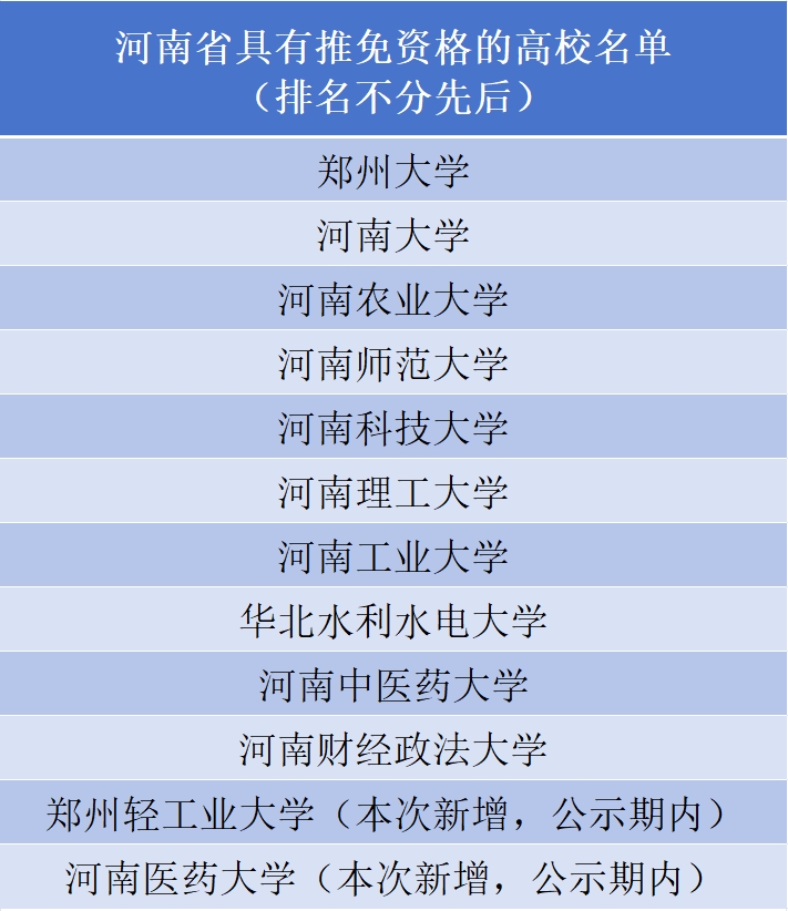 随着本次新增推免资格高校拟推荐名单的“官宣”,河南省未来将有12所高校具备保研资格。