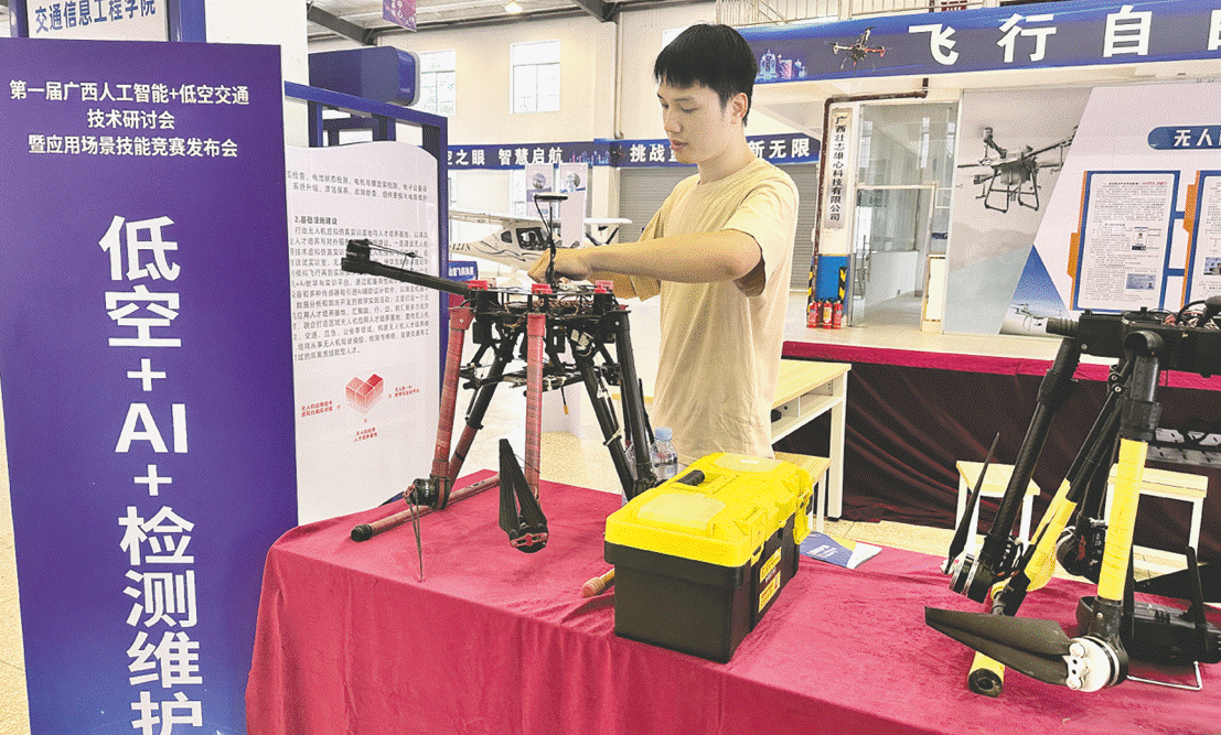 这一布局迅速形成产业聚合效应。2024年11月,学校联合广西北投低空经济投资有限公司、广西低空飞行服务站等28家单位发起成立广西低空交通科创联盟,覆盖技术研发、空域管理、商业应用全链条。2025年5月,自治区交通运输厅主办、学校承办的首届广西“人工智能+低空交通”技术研讨会,吸引交通运输部科学研究院等165家单位参会,展示了无人机集群灭火、车载巡检无人机母舱等十余项创新解决方案,彰显了职教技术创新的硬实力。