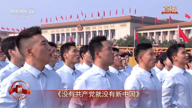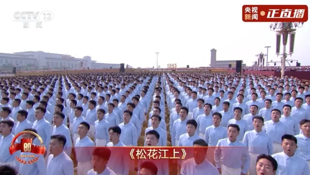 伴随着军乐团的演奏,《松花江上》《在太行山上》《保卫黄河》《没有共产党就没有新中国》等经典曲目被唱响,大家用豪迈的歌声,追忆烽火岁月,唱出中华儿女的不屈和希望,致敬伟大的抗战精神。