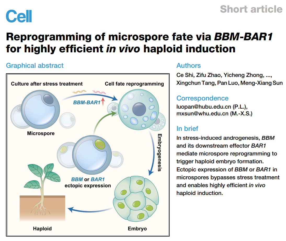 近日,孙蒙祥教授领导的武汉大学赴贵州师范大学帮扶团专家团队与湖北大学有关团队合作在国际顶级学术期刊《Cell》在线发表研究论文“Reprogramming of microspore fate via BBM-BAR1 for highly efficient in vivo haploid induction”。这是贵州师范大学首次以第一完成单位在CNS(即Cell、Nature、Science全世界最权威的学术杂志)上发表的重大研究成果,取得了历史性突破。