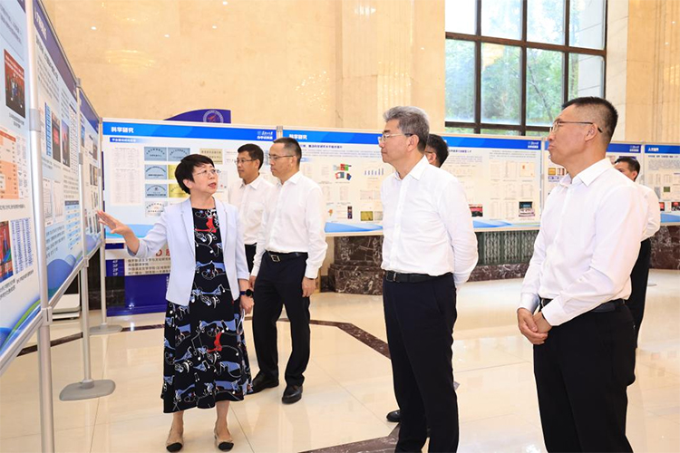 在主楼一楼大厅,吴岩参观了学校办学成果展,详细了解学校四项办学新战略、俄语学科建设、思政工作引领、科研创新成果转化、复合型人才培养等重点领域取得的显著成果。