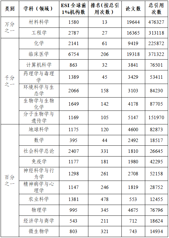 从学校ESI整体表现来看,ESI论文总数为107022篇,总引用次数为2220934次,ESI综合排名(按总引用次数)全球研究机构第84位,中国内地高校第10位。学校还拥有前千分之一学科数9个,前百分之一学科数19个。