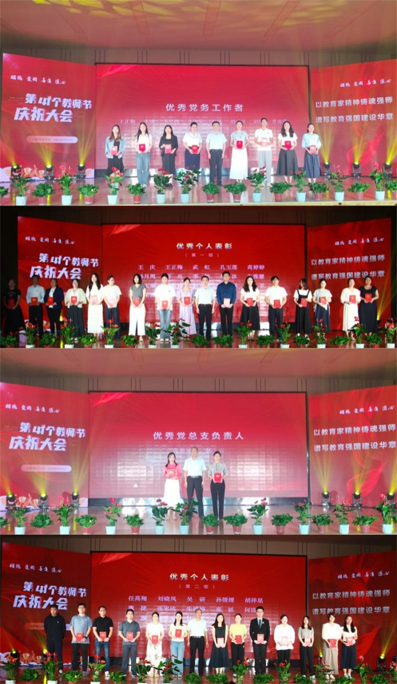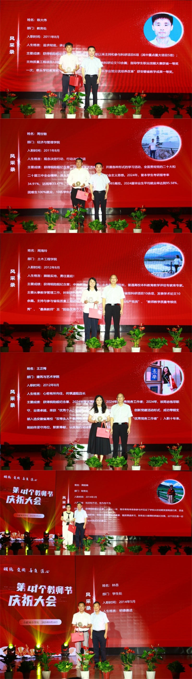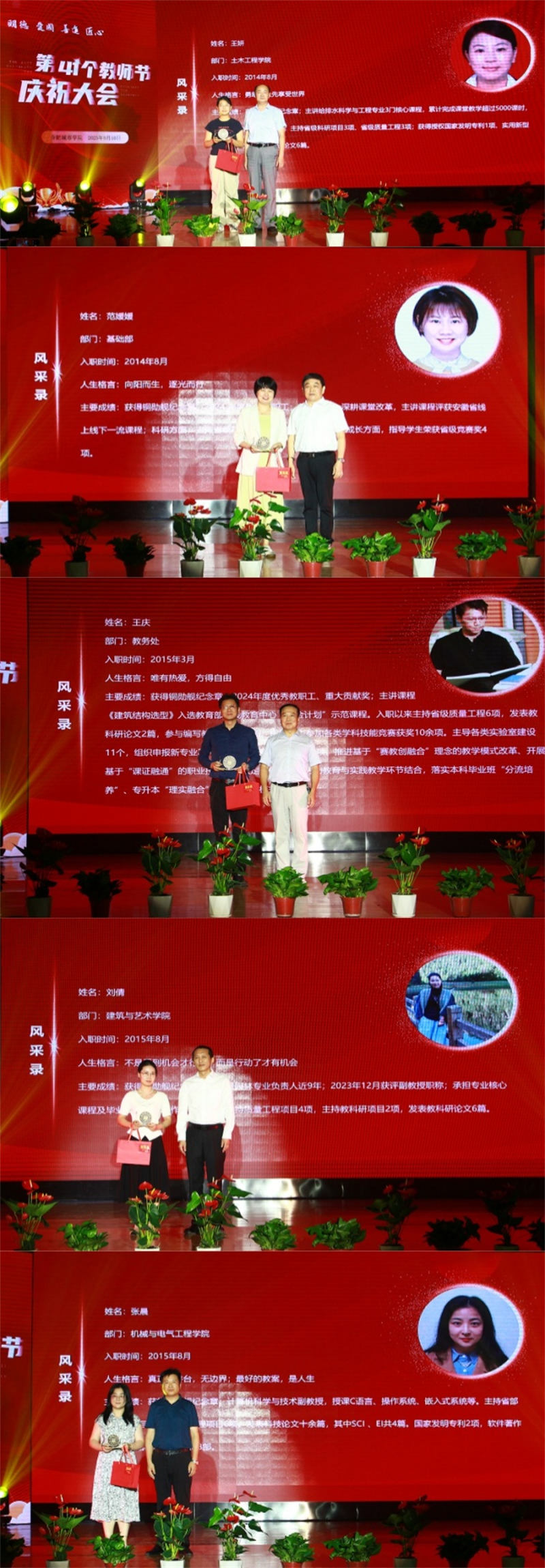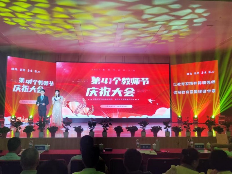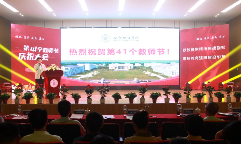 秋光为序,桃李飘香。9月10日,在第41个教师节之际,合肥城市学院全体教职工济济一堂,在滨湖校区隆重举行2025年教师节庆祝大会,表彰在党建思政、教育教学、管理服务等工作中涌现出来的先进集体、优秀个人,向来校工作十年以上老教师老职工颁授“合肥城市学院铜勋舰”纪念章,表达对他们多年来辛勤付出和无私奉献的充分肯定和衷心感谢,激励全体教职工凝聚“为党育人铸师魂 为国育才谱华章”的奋进共识。