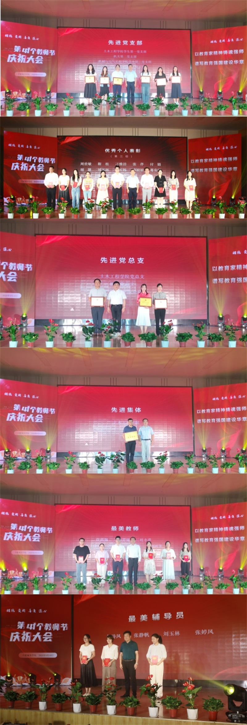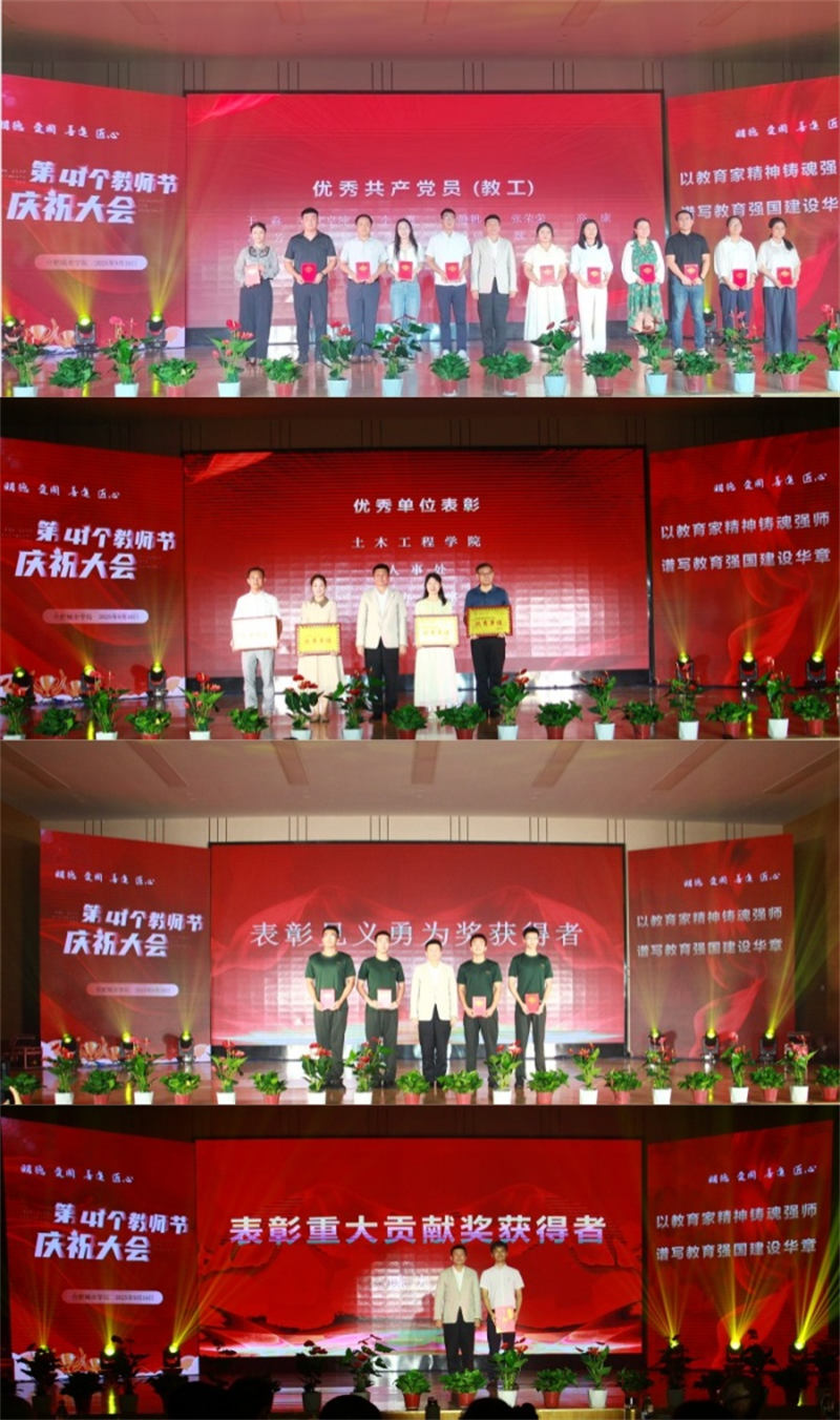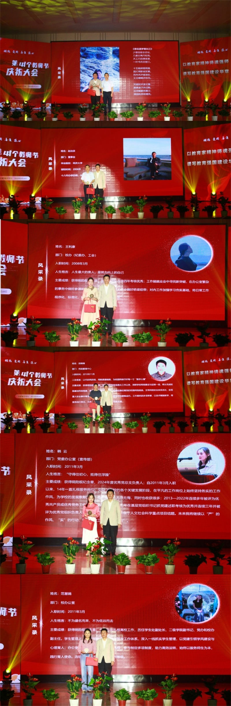 秋光为序,桃李飘香。9月10日,在第41个教师节之际,合肥城市学院全体教职工济济一堂,在滨湖校区隆重举行2025年教师节庆祝大会,表彰在党建思政、教育教学、管理服务等工作中涌现出来的先进集体、优秀个人,向来校工作十年以上老教师老职工颁授“合肥城市学院铜勋舰”纪念章,表达对他们多年来辛勤付出和无私奉献的充分肯定和衷心感谢,激励全体教职工凝聚“为党育人铸师魂 为国育才谱华章”的奋进共识。