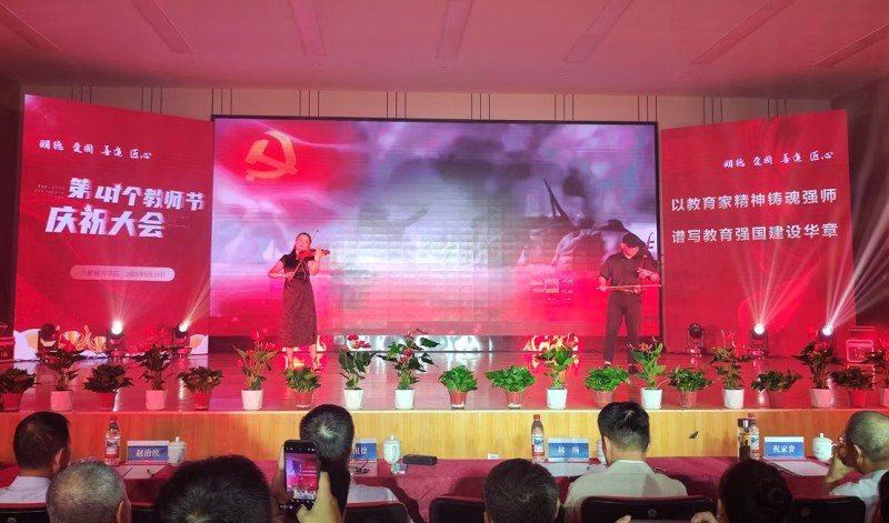 机械与电气工程学院教师表演的小提琴二胡合奏曲《如愿》婉转悠扬,表达对“三尺讲台系国运,一颗丹心育英才”的教育初心。