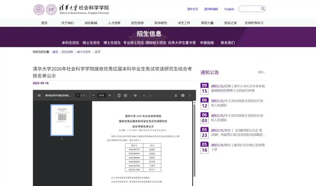 清华大学社会科学学院9月16日发布清华大学2026年社会科学学院接收优秀应届本科毕业生免试攻读研究生综合考核名单。其中,孙颖莎、王曼昱在列。