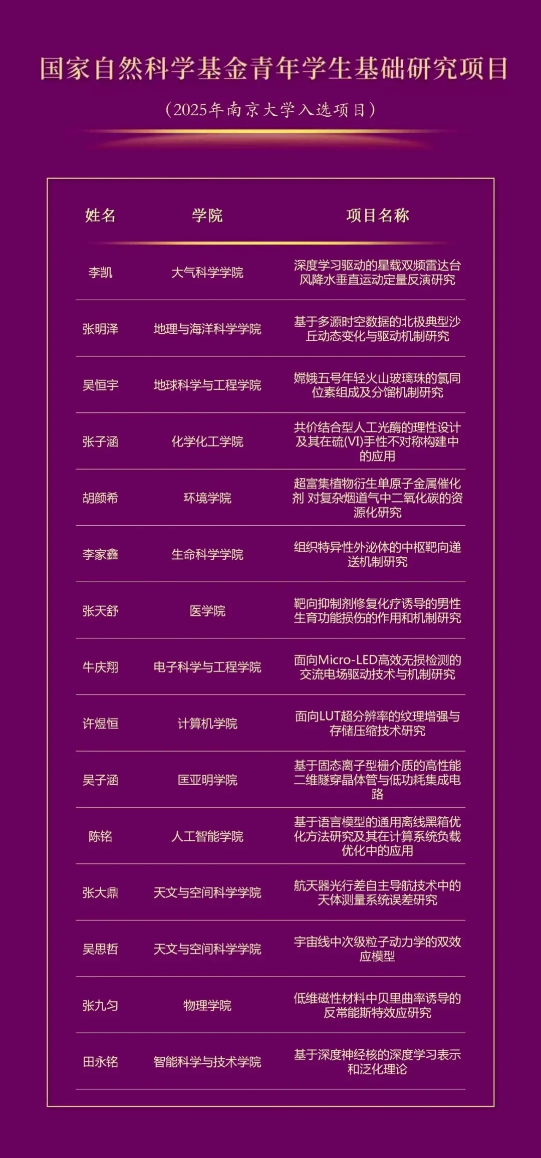 近日,国家自然科学基金委员会发布了2025年国家自然科学基金青年学生基础研究项目(本科生)评审结果。经过层层选拔,南京大学15名本科生获得项目资助,选题均直面基础科学艰深问题、科研攻关瓶颈难题、未来技术发展命题,展现了南京大学丰硕的育人成果,以及南大学子投身基础研究、矢志科研报国的青春风采。