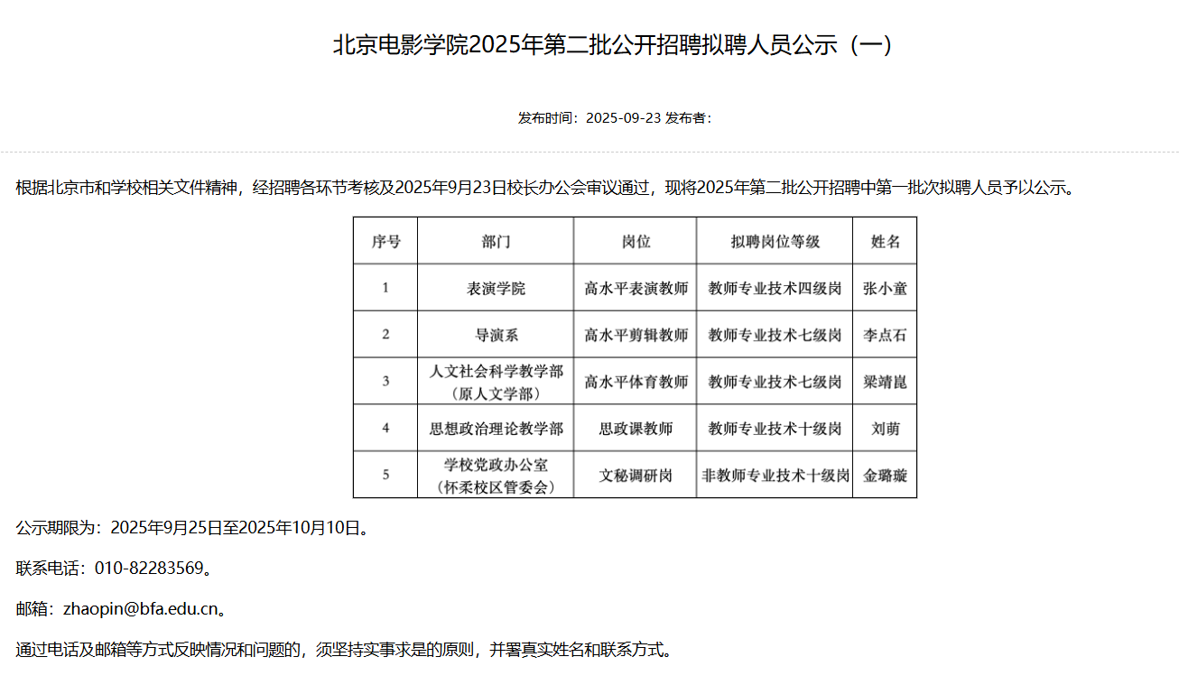 9月25日,北京电影学院人事处公示了北京电影学院2025年第二批公开招聘拟聘人员。其中,国乒名将梁靖崑拟任人文社会科学教学部(原人文学部)高水平体育教师,该岗位为教师专业技术七级岗。