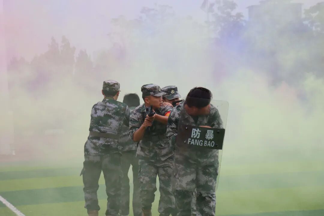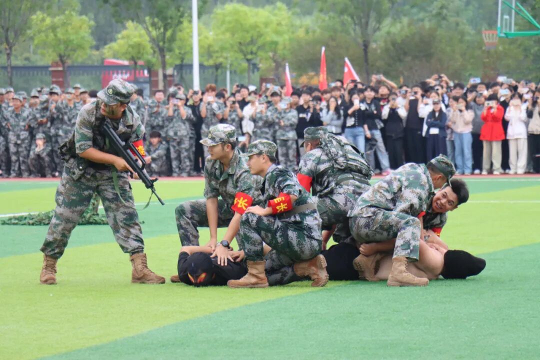 随着分列式进行曲响起,军训成果汇报展演震撼开场。绿茵场上,各方阵迈着铿锵步伐依次通过主席台。拳术方阵虎虎生风,出拳带起破空之声,“杀”声震天,尽显少年英气;匕首方阵寒光闪烁,利落的劈刺动作一气呵成,巾帼须眉皆展飒爽英姿;旗语方阵红白旗帜翻飞如浪,成员们默契配合,将无声指令化作整齐划一的视觉盛宴;防恐防爆方阵模拟突发场景,战术队形变换行云流水,盾牌与警棍碰撞声中,应急处突能力展露无遗。精彩的展演赢得现场掌声如潮,这是新生们用20天汗水凝结的亮眼答卷。