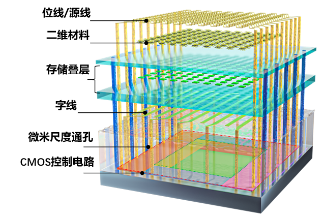 二维-硅基混合架构闪存芯片结构示意图,包含二维模块、CMOS控制电路和微米尺度通孔
