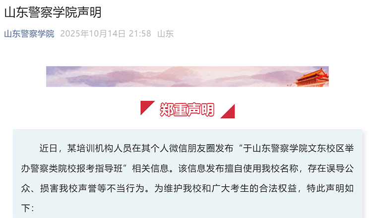 近日,某培训机构人员在其个人微信朋友圈发布“于山东警察学院文东校区举办警察类院校报考指导班”相关信息。该信息发布擅自使用我校名称,存在误导公众、损害我校声誉等不当行为。为维护我校和广大考生的合法权益,特此声明如下: