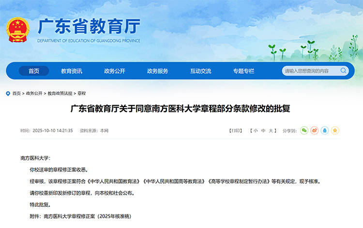10月10日,广东省教育厅在官网公布批复结果:“经审核,该章程修正案符合《中华人民共和国教育法》《中华人民共和国高等教育法》《高等学校章程制定暂行办法》等有关规定,现予核准。请你校重新印发新修订的章程,向本校和社会公布。”