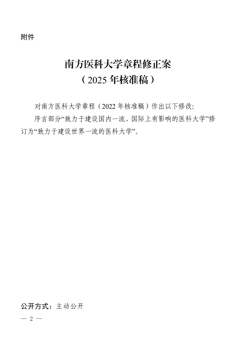 近日,南方医科大学提出对大学章程作出以下修改:序言部分“致力于建设国内一流、国际上有影响的医科大学”修订为“致力于建设世界一流的医科大学”。