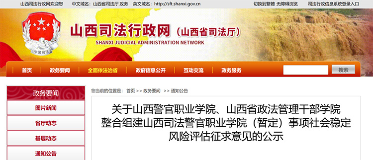 近日,山西省司法厅发布公示,为进一步优化司法行政系统职业教育资源配置,推动山西省法治人才培养工作高质量发展,根据《山西省“十四五”高等学校设置规划》,经研究决定将山西警官职业学院、山西省政法管理干部学院整合组建山西司法警官职业学院(暂定)。