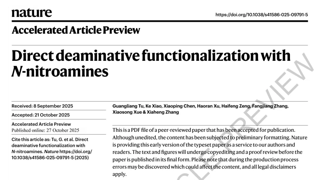 北京时间10月28日,国际权威期刊Nature发表了国科大杭州高等研究院(以下简称“杭高院”)化学与材料科学学院(以下简称“化材学院”)研究员张夏衡团队最新成果——“Direct deaminative functionalization with N-nitroamines”。该成果受到Nature四位主审稿人的高度评价,作为审稿人之一的国际制药巨头辉瑞公司高级研发总监Scott Bagley给予评价:“true tour de force”(法语:真正的杰作)。