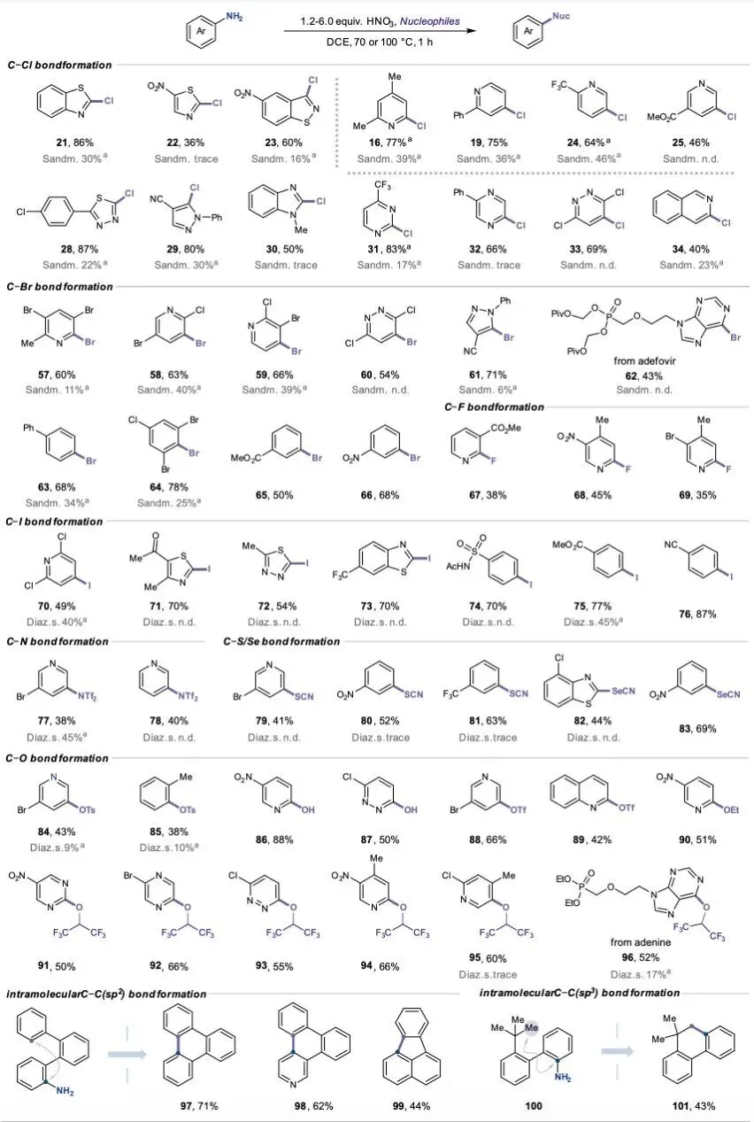 该研究利用芳香胺在硝酸介导下原位形成N-硝胺中间体,随后通过脱除一氧化二氮(N₂O),实现芳香C−N键向多种C−X键(包括C−Br, C−Cl, C−I, C−F, C−N, C−S, C−Se与C−O)以及C‑C键的高效直接转化。与经典的Sandmeyer反应条件相比,新方法在药物合成中常用的多氮杂环体系里展现出显著优势;与其他脱氨官能化方法相比,此策略的核心优势在于仅凭实验室极易获取的简单试剂,就实现了出色的通用性:几乎适用于所有类型的药用杂芳胺及电性、结构各异的苯胺衍生物,不受氨基位置限制,并且能够以简易操作实现公斤级的规模化生产。
