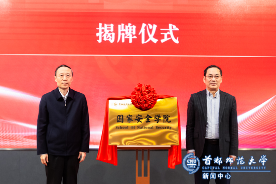 北京市委副秘书长刘志伟与首都师范大学校长方复全共同为国家安全学院揭牌。