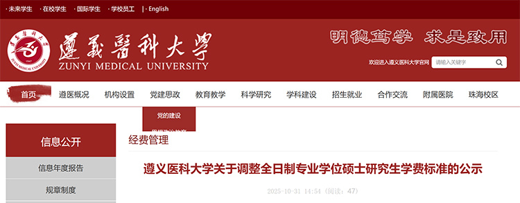 遵义医科大学关于调整全日制专业学位硕士研究生学费标准的公示