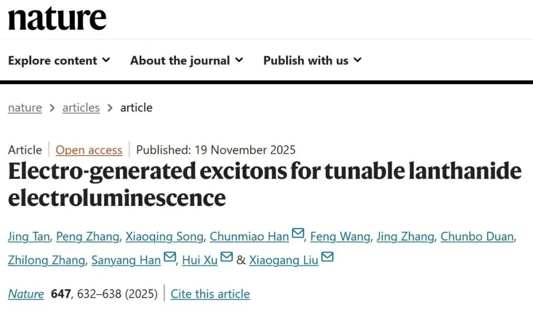 11月20日,黑龙江大学许辉教授团队与合作者打磨了十四年的研究成果以“捕获电生激子实现可调谐的镧系纳米晶电致发光”为题,在线发表于国际顶级期刊Nature,这是黑龙江大学首篇Nature论文,也是黑龙江省化学学科首篇Nature论文。