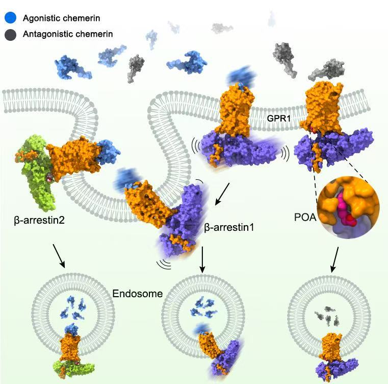 趋化素(chemerin)是一种重要的脂肪因子,参与调控脂质代谢和胰岛素敏感性,与肥胖、糖尿病等代谢性疾病的发生发展密切相关。同时,趋化素还能介导免疫细胞定向迁移至炎症部位,参与机体抵御病原入侵、维持稳态和修复组织损伤等重要生理过程,在炎症与代谢之间发挥“桥梁”作用。趋化素的生物学效应由其受体介导,包括CMKLR1和GPR1。其中,CMKLR1作为一种典型的G蛋白偶联受体(GPCR),通过G蛋白信号通路驱动脂质代谢与炎症反应,而GPR1则是一种非典型的GPCR,依赖于阻遏蛋白介导的信号通路和受体内吞,清除过量的趋化素。趋化素及其受体通过这种“经典激活—非典型平衡”的双重机制,在代谢平衡和炎症反应调控中发挥关键作用,但相关分子机制一直未被明确阐明。