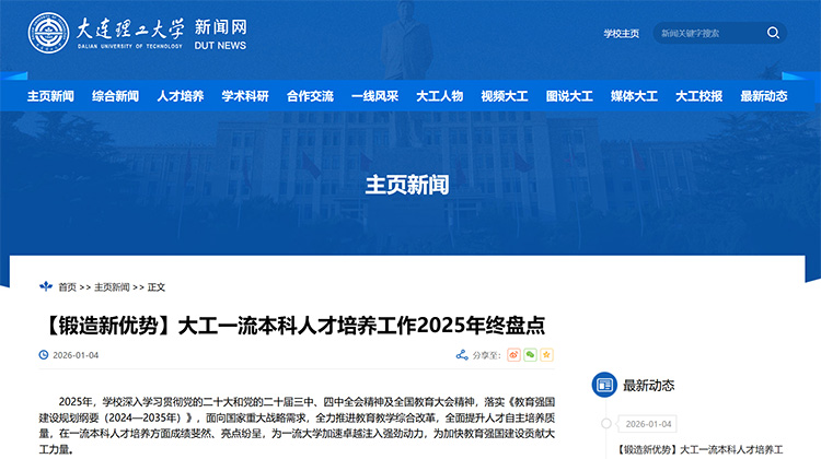 1月4日,大连理工大学官网发文《【锻造新优势】大工一流本科人才培养工作2025年终盘点》,其中提到:拔尖创新人才培养新模式影响力不断扩大,本科生源质量持续提升。学校本科生推免保研率平均超过30%,本科生在国内外高水平大学的深造率超过60%。