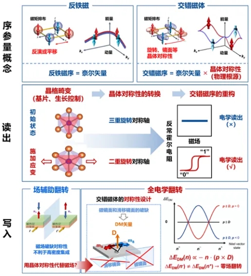 第三类磁体—交错磁体的晶格指纹特征。使交错磁体区别于反铁磁的物理根源是其独特的晶体对称性。操控晶体对称性,实现了交错磁序的重构和读出信号的产生。