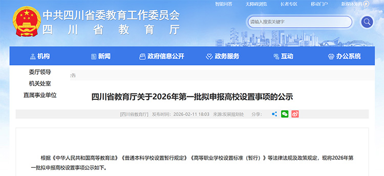 2月11日,四川省教育厅发布《关于2026年第一批拟申报高校设置事项的公示》。根据《中华人民共和国高等教育法》《普通本科学校设置暂行规定》《高等职业学校设置标准(暂行)》等法律法规及政策规定,现将2026年第一批拟申报高校设置事项公示。其中,以川北医学院为基础,拟设置川北医科大学。