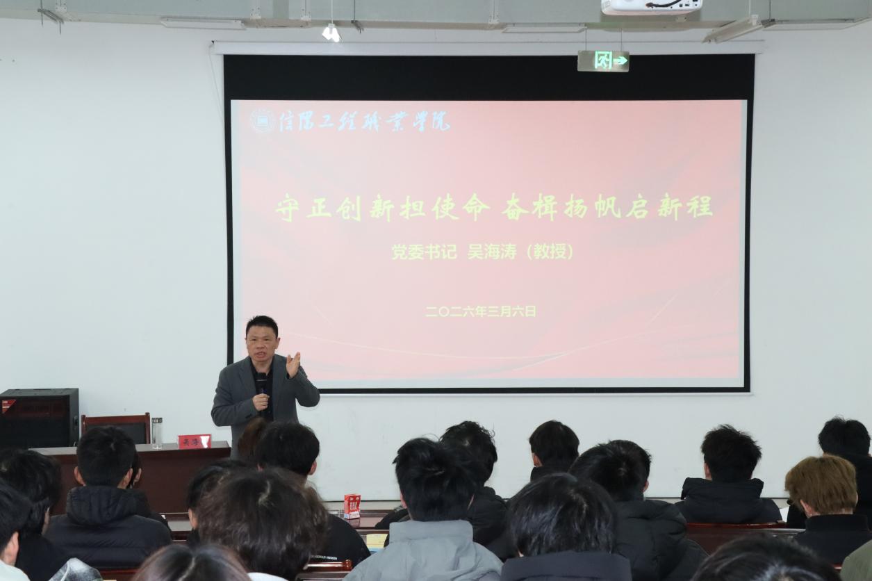 春回校园启新程,思政领航育新人。为深入学习贯彻党的二十大和二十届历次全会精神,引导广大师生坚定理想信念、勇担时代使命,3月6日上午,信阳工程职业学院党委书记吴海涛以《守正创新担使命 奋楫扬帆起新程》为题,为学校师生讲授了一堂思想深刻、催人奋进的开学思政第一课,激励全体师生以崭新姿态开启新学期新征程。