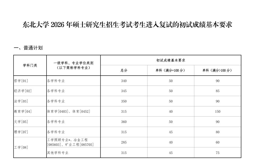 东北大学2026年硕士研究生招生考试考生进入复试的初试成绩基本要求