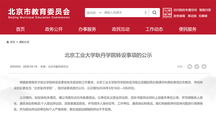 3月16日,北京市教委发布公示,北京工业大学耿丹学院将转设为独立设置的民办普通本科高校,转设后拟更名为“北京耿丹学院”。