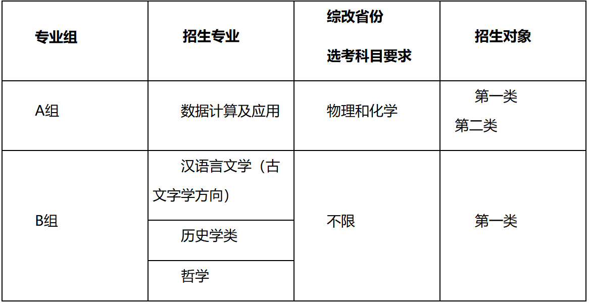 初试考核方式为笔试,专业A组重点考查考生数理科技相关领域知识积累、学习兴趣、综合素质等,专业B组重点考查考生文史哲相关领域知识积累、学习兴趣、综合素质等。考查范围均不限于高中课程标准范围。