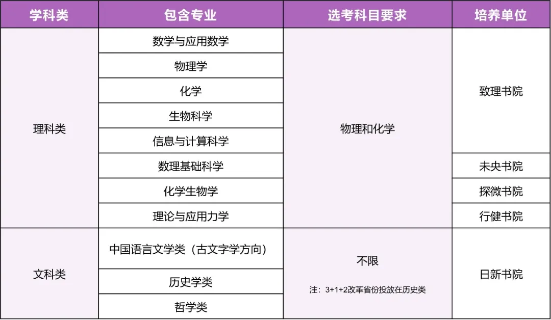 基础文科类专业旨在选拔并培养在基础文科领域有特长且有志于从事相关研究的学生,包括:中国语言文学类(古文字学方向)、历史学类、哲学类专业。