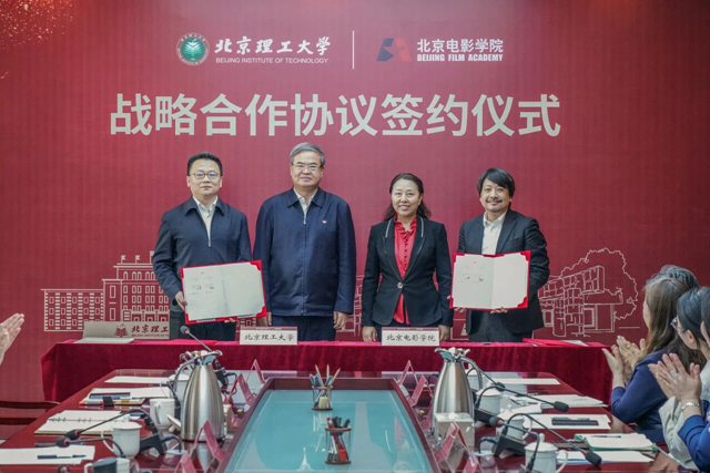 为推动文化与科技深度融合,一体推进教育科技人才发展,奋力实现“十五五”良好开局,4月23日下午,北京理工大学与北京电影学院举行战略合作框架协议签约仪式。北京理工大学党委书记张军院士,党委常委、副校长王博,党委常委、党委宣传部部长蔺伟;北京电影学院党委书记周志军,党委副书记、院长扈强,党委副书记支宏伟,党委常委、纪委书记刘新军,党委常委、副院长李伟,党委常委、怀柔校区管委会党总支书记陆花参加签约仪式。