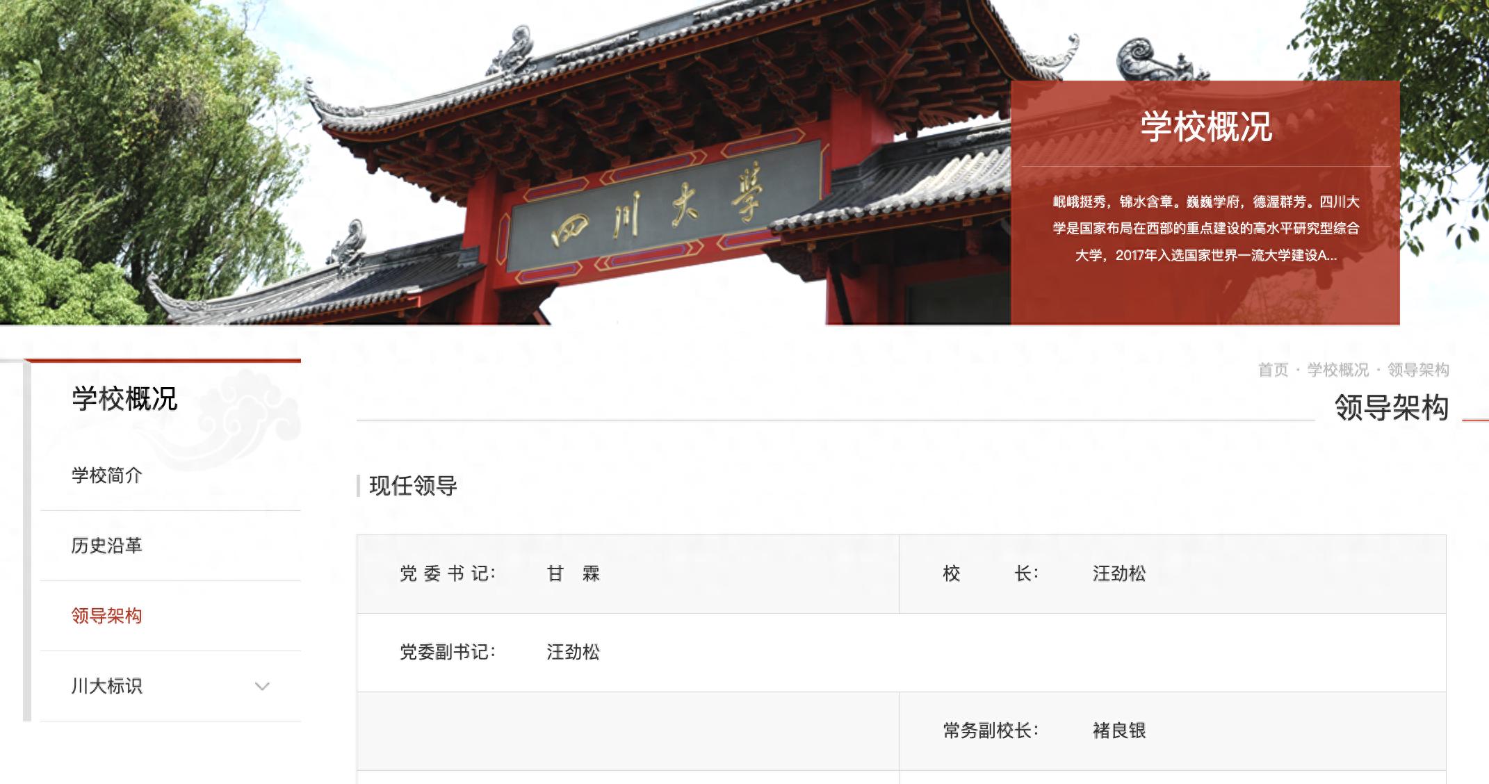 四川大学官网“现任领导”栏近日更新,九三学社四川省委会副主委褚良银担任四川大学常务副校长。