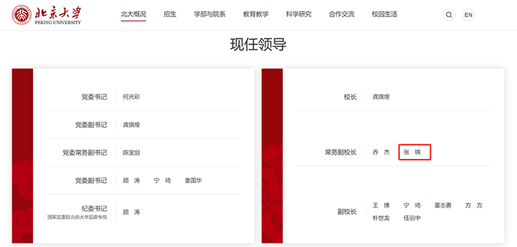4月10日,北京大学官网“现任领导”一栏更新显示,张锦已任北京大学常务副校长。