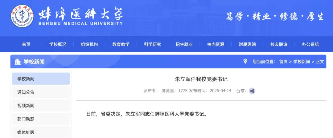 据蚌埠医科大学官网消息,日前,安徽省委决定,朱立军同志任蚌埠医科大学党委书记。