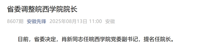 据微信公众号“安徽先锋”8月13日消息,日前,安徽省委决定,肖新同志任皖西学院党委副书记,提名任院长。