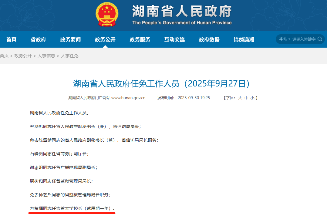 近日,湖南省人民政府官网发布消息,湖南省人民政府任免工作人员,其中任命方东辉同志为吉首大学校长(试用期一年)。吉首大学官网显示,方东辉现为吉首大学党委副书记、校长,主持学校行政全面工作,此前任吉首大学党委委员、副校长。学校上一任校长黎奇升任职时间为2022年4月-2024年9月。